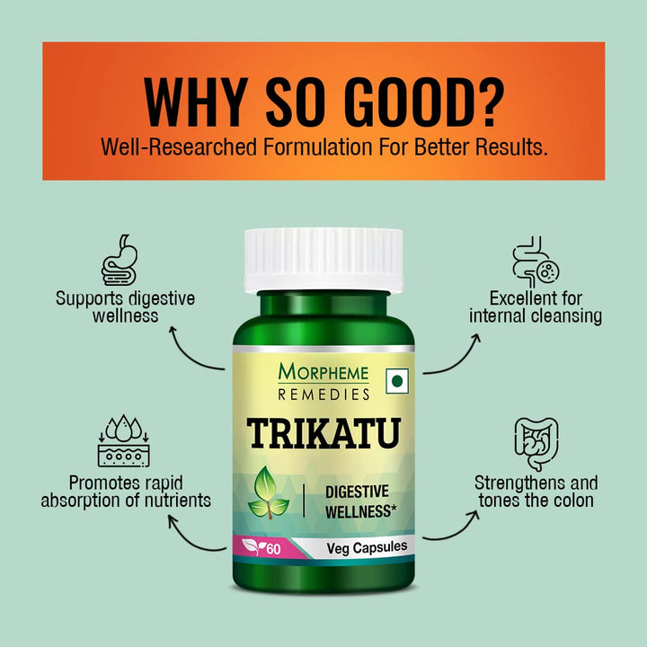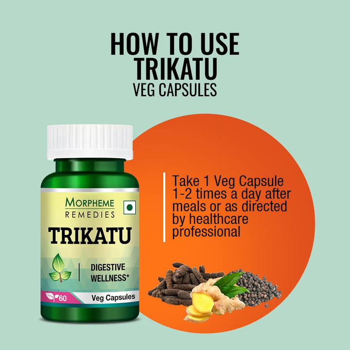 Morpheme Trikatu contains Extracts of Long pepper (piper longum fruits) (166. 66 mg. ), Black pepper (Piper nigrum fruits) (166. 67 mg. ), Ginger (Zingiber officinale rhizome) (166. 67 mg).
